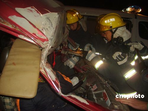 12月24日,山東棗莊發(fā)生一起兩車追尾事故。當(dāng)?shù)叵乐ш?duì)特勤中隊(duì)接到報(bào)警后,派出12名消防官兵、一輛搶險(xiǎn)救援車和一輛水罐車。經(jīng)過近半個(gè)小時(shí)施救,2名被困人員成功獲救。中新社發(fā) 季龍 攝