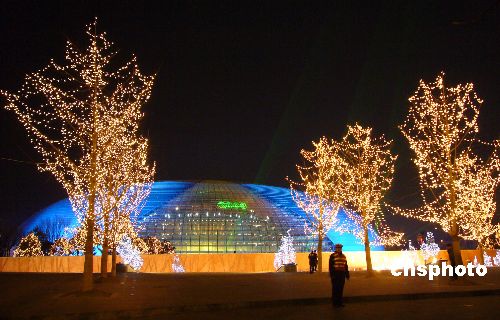 12月30日晚,北京國家大劇院四周燈光閃爍,夜色璀璨,蔚藍色的國家大劇院在夜幕中顯得美麗迷人。當晚,有關人員在調試燈光,以迎接12月31日在這里舉行的2008年新年音樂會。中新社發 玉龍 攝