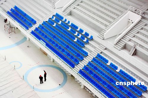 圖:北京“水立方”安裝座椅迎接月底首場賽事