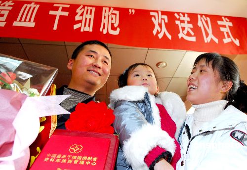 1月7日,造血干細(xì)胞捐獻(xiàn)者張文杰在歡送儀式上與妻女在一起。當(dāng)日,西安鐵路局西安供電段職工張文杰在中國造血干細(xì)胞捐獻(xiàn)者資料庫陜西管理中心工作人員的陪同下,前往西安唐都醫(yī)院捐獻(xiàn)造血干細(xì)胞,挽救一位素不相識(shí)的白血病患者的生命。據(jù)了解,張文杰是陜西省鐵路系統(tǒng)首位造血干細(xì)胞捐獻(xiàn)者。中新社發(fā) 唐振江 攝