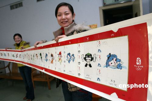 1月8日,河南省許昌市郵政局集郵公司的工作人員在展示《奧運大長卷》!秺W運大長卷》巨幅郵票是北京奧組委破例審批的超大規模奧運珍品郵票,總長達到6.33米。該郵票包含了北京奧運會會徽、吉祥物、38個運動分項造型和北京奧運口號等,有128枚連接在一起,單個項目福娃的規格是普通郵票的25倍,是史上規模最大和奧運郵票最全的北京奧運特種郵票長卷。據悉,6.33米長的《奧運大長卷》郵票比以往我國發行的《清明上河圖》郵票長卷還要長上1米多,其長度和包含的郵票內容都創造了奧運郵票發行的新紀錄。中新社發 牛書培 攝