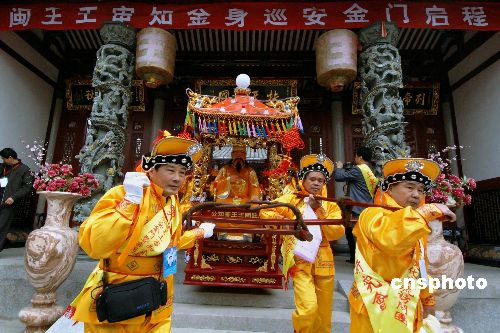 一月八日,福州市晉安閩臺王審知研究會在福州蓮花山閩王紀念館舉行儀式,歡送閩王金身首次巡安金門。九日上午,閩王金身將經廈金航線直航金門,進行為期四天的巡安活動。中新社發 王東明 攝