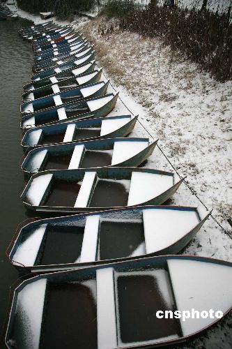 1月12日晚,江城武漢迎來2008年第一場雪,當晚,該市氣象臺發布道路結冰橙色預警信號。1月13日,武漢城區被積雪覆蓋。中新社發 王振武 攝