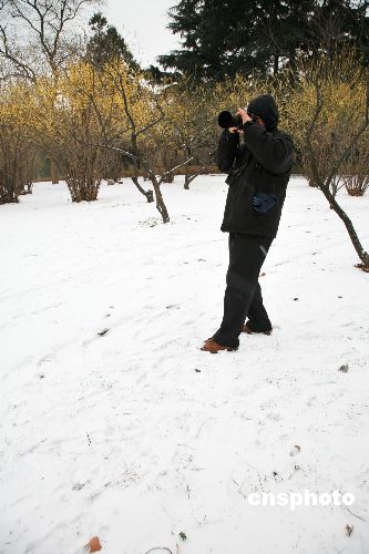 1月13日,一位攝影愛好者在公園拍攝雪景。