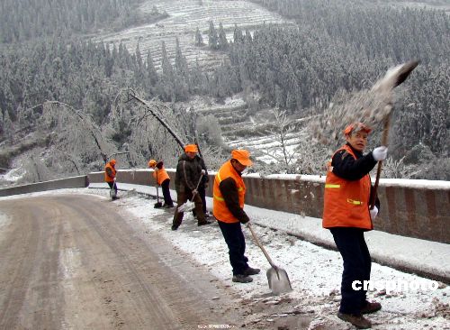 1月24日,四川瀘州敘永道班工人正在321國道上清掃積雪,確保道路暢通。受冷空氣影響,該縣南面鄉鎮普遍遭受15年不遇的冰雪災害襲擊,全縣12個鄉鎮、25萬人受災。該縣境內321國道等4條國、省道共59公里路段因路面結冰而封閉,11個鄉鎮因冰雪壓斷電線、電桿而停電。災情發生后,該縣成立指揮部組織抗災救災工作。據氣象部門預測,冰雪低溫天氣還將持續一周左右,災情仍在持續。中新社發 黃虎 攝
