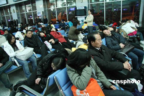 1月27日消息,1月13日以來,湖南省遭遇1954年以來,50年不遇的、持續時間最長、氣溫最低的冰凍天氣,長沙機場受冰雪天氣影響,飛機跑道結冰,導致大面積航班取消或延誤,25日當晚19點15分機場開始關閉,場內2000多名已辦登機手續或途經此中轉的返鄉乘客滯留在候機廳內。中新社發 蘇巧帥 攝