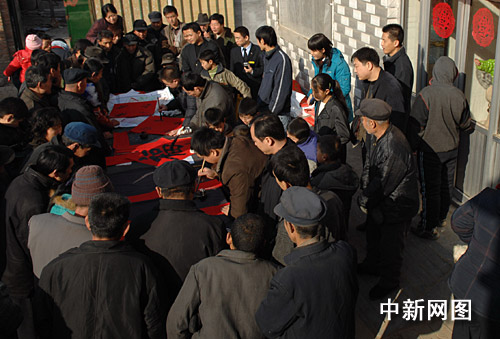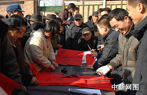 1月31日,河北滄州市部分書法家、企業家來到“感動中國支教模范”白芳禮的家鄉滄縣白賈村,為鄉親們書寫春聯。王少華 攝