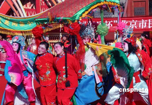 2月6日,“第七屆北京民俗文化節暨第十屆東岳廟春節文化廟會”在喜慶熱烈、歡樂祥和的氛圍中開鑼。東岳廟作為北京奧運會主場館所在地朝陽區唯一的民俗類專題博物館,是次廟會以“祈福納祥迎奧運”為主題,活動內容精彩紛呈,既有傳統的非物質文化遺產展示,亦有新增加的民俗活動“請福牌”、“畫福布”、“請五福”、“掛盤香”等活動。同時“東岳杯”朝陽區民間花會大賽的11個區縣、32檔花會也同臺競技。中新社發 錢興強 攝