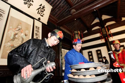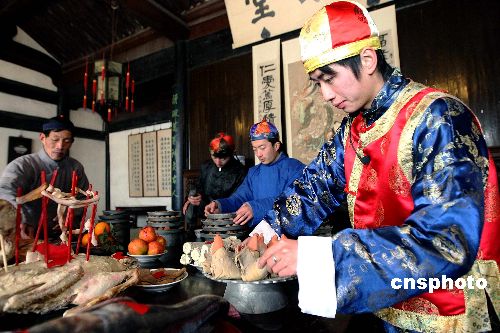 2月8日,紹興魯迅故里舉行“祝福”祭祀活動。當日是農歷正月初二,浙江紹興魯迅故里在周家老臺門模仿魯迅小說《祝福》的場景,從正月初一至初五每天進行紹興傳統年俗“祝福”場景表演。紹興的年俗“祝福”因魯迅小說而名揚天下,浙江省將紹興魯迅故里“祝福”定為惟一的春節保護示范地。中新社發 袁云 攝