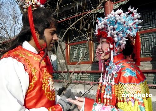 2月8日,由北京大觀園主辦的第十三屆紅樓廟會吸引眾多游客。在本屆廟會諸多活動中,由印度青年扮裝的紅樓人物“賈寶玉”成為亮點。圖為“賈寶玉與林黛玉”亮相大觀園紅樓廟會。中新社發 錢興強 攝