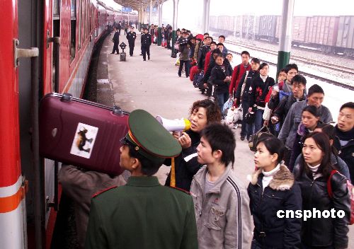2月8日,成都鐵路局福泉火車站出現節后第一次民工返程高峰。面對貴州民工流和旅游流的蜂擁而來,成都鐵路局福泉火車站采取應急預案,確保民工有序購票乘車。中新社發 姜澤鵬 攝