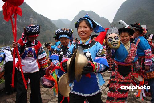 2月8日,大年初二,貴州省興義市間歇泉民族村布依族、苗族風情演出隊在表演自編自導的民族舞蹈。當日,貴州省興義市間歇泉民族村村民自發在村里組織了一臺自編自導的民族風情表演及體育活動,拉開了山寨鬧新春,迎奧運的序幕。中新社發 韋波 攝