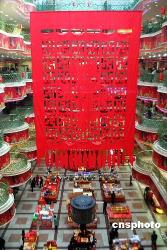 2008年2月9日,沈陽商業城共享大廳空中高懸有四層樓高、用紅綢布特制的巨大“掛簽”,上面還剪刻了栩栩如生的米老鼠,以歡度新春佳節。 中新社發 劉寶成 攝