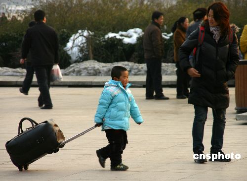 2008年2月11日,春節(jié)長假接近尾聲,人們紛紛踏上返程路,有的回家,有的奔赴工作崗位。南京火車站因此迎來春節(jié)后的客流高峰。中新社發(fā) 阿董 攝