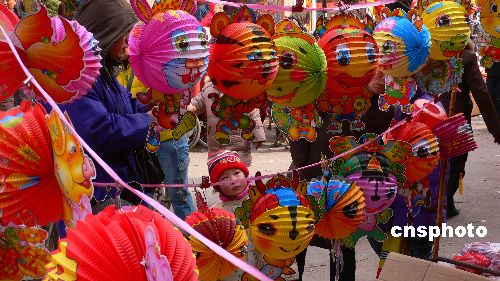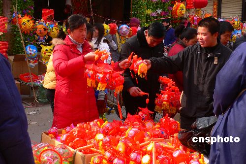 2月13日,人們在河南開封市大相國寺市場選購花燈。農(nóng)歷正月十五臨近,古城開封市各種生肖動物、奧運福娃等圖形的燈籠紛紛上市,喜迎元宵佳節(jié)。中新社發(fā) 凱楓 攝