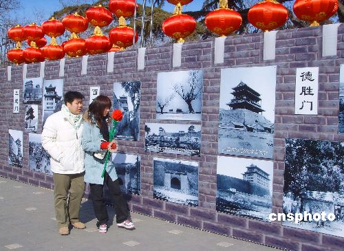 2月13日,北京龍潭湖廟會舉辦的最后一天,園中展出的老城門照片吸引了眾多市民的目光。中新社發 玉龍 攝