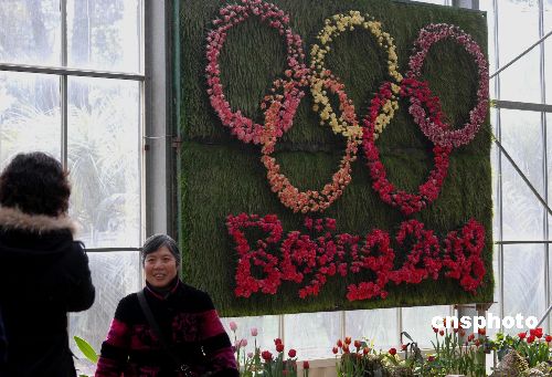 2008年2月14日,湖北武漢市植物園用數千朵康乃馨組成的北京2008奧運會五環圖案和各種栩栩如生的體育比賽項目圖案,吸引了前來賞花游園的市民。中新社發 楚天行 攝