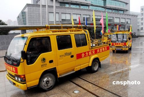 2月18日上午,浙江省溫嶺市供電局的10多輛電力搶修車載著100多名電力搶修隊員趕赴仙居,他們將與該局的“先遣部隊”一起搶修10千伏溪港872麻山方向的受損線路,并力爭元宵節前完成搶修。中新社發 吳鵬飛 攝