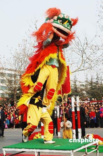 2月20日,山東淄博周村區舉行元宵節民間藝術文藝匯演,震天的鑼鼓、歡快的秧歌、威武的獅子、翻飛的龍燈以及劃旱船、抬芯子、跑竹馬等民間藝術形式一一上演,讓人們熱熱鬧鬧過元宵。中新社發 董乃德 攝
