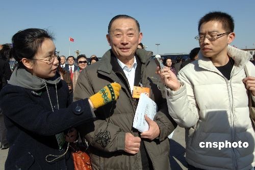 三月三日下午,梅蘭芳之子梅葆玖在北京人民大會堂前受到記者追訪。當日下午,全國政協十一屆一次會議在北京隆重開幕。中新社發 王東明 攝