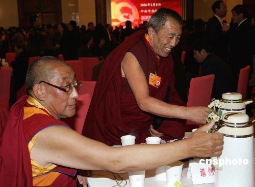 三月三日下午,全國政協十一屆一次會議在北京人民大會堂隆重開幕,來自西藏的全國政協委員在會場喝到可口的茶水,深感“賓至如歸”。中新社發 潘索菲 攝