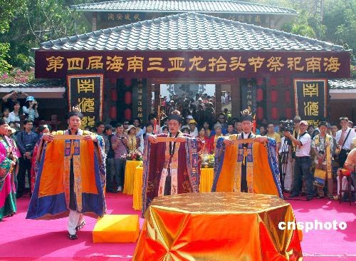 3月9日是中國農(nóng)歷二月初二,民間傳統(tǒng)的龍?zhí)ь^節(jié),中國各地都有不同的習(xí)俗祭龍祈福。海南因四面環(huán)海,百姓對此節(jié)日更顯重視。第四屆海南三亞龍?zhí)ь^節(jié)祭祀南海暨三亞“藍絲帶”海洋保護海南行首發(fā)式當(dāng)天在三亞南山大小洞天景區(qū)隆重舉行。人們舉行莊嚴(yán)的道教儀式祭祀南海與南海龍王,祈禱風(fēng)調(diào)雨順,國泰民安。中新社發(fā) 尹海明 攝