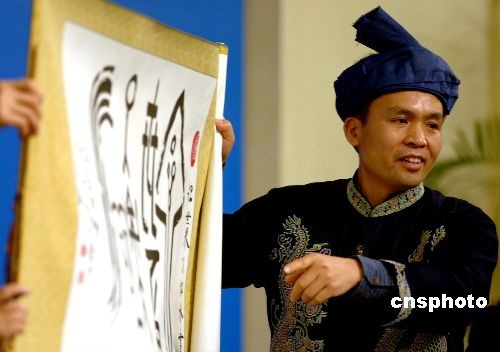 三月十日,貴州水族人大代表張加春在記者會上介紹“水文字”,并呼吁要大力保持“水文化”的獨特性。當日,八位少數民族代表在北京兩會新聞中心接受媒體采訪。中新社發 王東明 攝