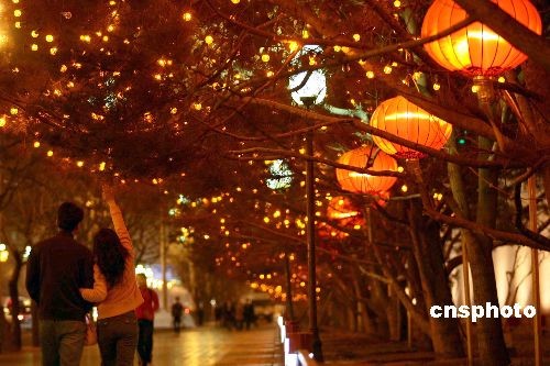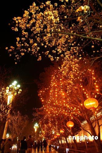 3月12日夜晚,一對情侶在北京西長安街的紅墻外觀燈、賞花。兩會期間,北京長安街紅燈籠高掛,與盛開的玉蘭花相映,烘托出慶祝氣氛。中新社發 盛佳鵬 攝