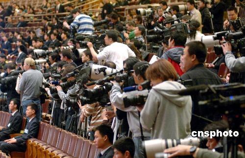 三月十五日上午,十一屆全國人大一次會議第五次全體會議在北京人民大會堂舉行,表決關于批準國務院機構改革方案的決定草案,選舉十一屆全國人大常委會委員長、副委員長、秘書長和常委,選舉國家主席、副主席及中央軍委主席等。中外媒體云集采訪大會。中新社發(fā) 王東明 攝