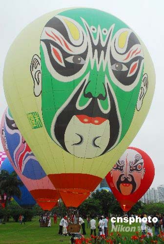 2008年4月28日,來自全國各地的40個熱氣球在海口市萬綠園進行系留飛行,供海口報名參與的2000名市民乘坐體驗升空。中新社發(fā) 善平 攝