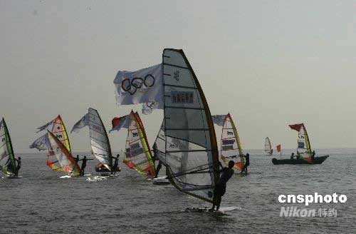 5月6日上午8時10分,北京奧運圣火在海南省海口市傳遞,為海南省奪得首枚全運會金牌的女子帆板運動員王麗芳傳遞第一棒火炬。圖為海口西海岸海上帆板隊掛滿奧運五環(huán)旗祝賀奧運圣火在?趥鬟f。中新社發(fā) 尹海明 攝