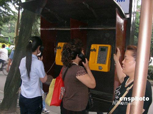 5月12日下午14時27分,四川汶川縣發生7.8級地震,成都市民在公用電話前排隊,焦急地向家人報平安。 中新社發 楊杰 攝