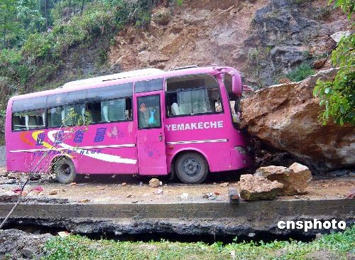 5月13日,通往四川省北川縣的公路已分層變形,一輛被巖石擊中的大巴車車頭嚴重變形。12日的地震在該路段引起多處山體滑坡,不少車輛被滾石擊中。中新社發 杜遠 攝