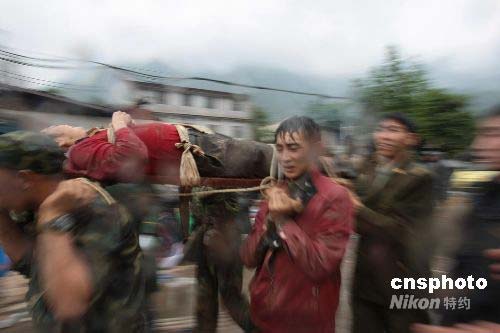 5月13日,中國空降兵6500多名官兵分別乘坐空軍遠輸機奔赴四川重災區,分五路兵力,分別在什邡、德陽、茂縣、等重災區展開救援。圖為解放軍士兵成功救出一名傷者。中新社發 譚超 攝