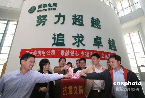 5月14日,供電員工為地震災區捐款。當天,江蘇連云港供電公司組織“奉獻愛心,支援災區”義捐活動,供電員工紛紛用捐款的方式表達對災區人民的深切關注之情。中新社發 耿玉和 攝