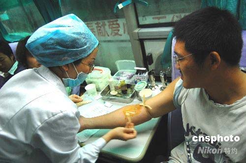 5月14日,重慶市西南大學(xué)育才學(xué)院近500名同學(xué)冒著大雨排隊獻(xiàn)血。重慶市合川區(qū)血液中心來到校園進(jìn)行采集血液,引起了大量學(xué)生的踴躍報名獻(xiàn)血,場面一度失控。同學(xué)們血脈相通汶川,紛紛表示了對災(zāi)區(qū)人民的慰問之情。血液中心負(fù)責(zé)人介紹說,當(dāng)天采集了200余名學(xué)生的血液,將馬上運(yùn)送到最需要的災(zāi)區(qū)。中新社發(fā) 許康平 攝