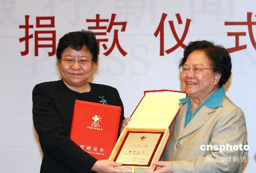 5月14日,中國銀行在北京舉行捐贈儀式,向中國紅十字總會捐款1000萬元人民幣,用于汶川地震災(zāi)區(qū)援救工作。中國銀行副行長張燕玲(左)接受捐款證書并在發(fā)布會上介紹:中國銀行各一級分行、直屬分行已為此次抗震救災(zāi)開啟緊急“綠色通道”,免除全部捐款的匯款手續(xù)費(fèi)。中新社發(fā) 廖文靜 攝