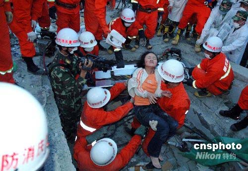 5月14日,重慶消防抗震救災突擊隊官兵成功救出一名幸存者。13日晚19時30分,重慶消防抗震救災突擊隊首批力量200名官兵歷經12小時的長途奔襲,順利抵達北川中學,并全面展開救援。截至14日下午19時,重慶消防抗震救災突擊隊首批力量已成功從廢墟中救出22條生命。中新社發 萬明 攝