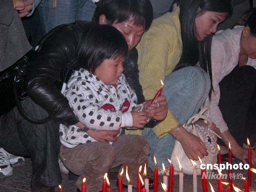 五月十四日晚,昆明市數百群眾自發來到市中心的東風廣場,點燃蠟燭,為災區群眾祈禱。圖為一位小女孩在家長的幫助下點燃蠟燭為災區祈福。中新社發 史廣林 攝