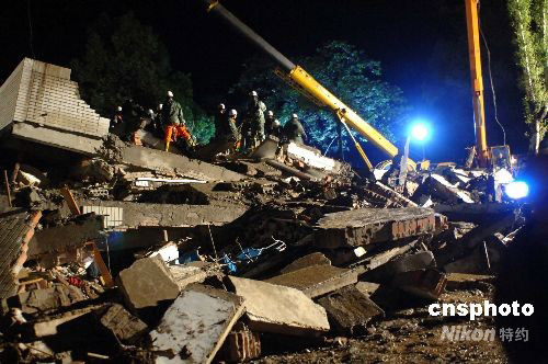 四川汶川縣5月12日發生7.8級地震后,北川縣北川中學受到極大的迫害,將近三千名的學生中僅有一半學生生存,另一部分學生因樓房倒塌而遇難或受傷。抗震消防隊員不顧艱險連續工作,利用不同工具挖掘被壓人員,并及時成功搶救出一批學員。中新社發 鄒憲 攝