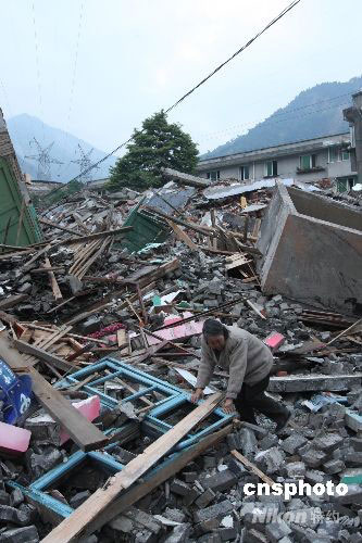 5月12日中國汶川縣發生7.8級地震,地震震中汶川災區映秀鎮中被心夷為平地。中新社發 黃榮 攝