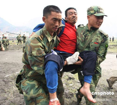 5月15日,武警官兵把剛剛搶救出的的汶川縣重傷災民送上直升機,運到成都救治。中新社發 張雷 攝