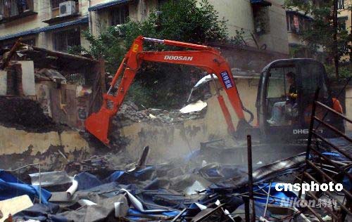 2008年5月15日,來自成都市企業(yè)的志愿抗震救災(zāi)隊伍攜帶大型機械車輛開到都江堰市區(qū),幫助展開危樓居民區(qū)的排險、救災(zāi)、防疫工作。汶川7.8級地震,給都江堰市帶來巨大破壞,目前危樓居民疏散、安置工作已展開,取得一定成果。中新社發(fā) 鄒憲 攝