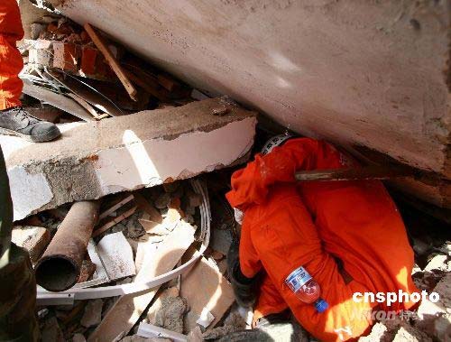 十五日十四時,福州消防支隊赴川抗震救災官兵在青川縣賓和路一家主建筑已全部坍塌的大型汽車維修廠,用生命探測儀成功解救出一名被困女工。當時,在接群眾求助后,救援隊立即趕赴現場,搜索分隊首先用生命探測儀確定了女工被困的大概方位,救援分隊迅速啟動救生氣墊,并用鐵鍬和雙手以土工的方式為被困女工打開了一條生命通道,半個小時后,被困女工被成功救出。中新社發 朱曉航 攝