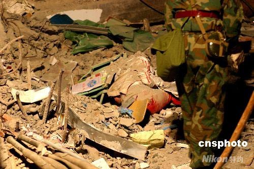 “五·十二”震災讓北川中學幾乎被夷為平地,數以百計的師生被掩埋。到十六日凌晨,從廢墟里面再挖出生命的希望越來越渺茫,救援隊員們還在繼續工作。中新社發 孫宇挺 攝