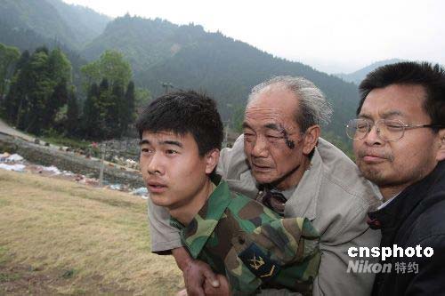 連日來,成都軍區(qū)空軍出動(dòng)1300多名官兵奔赴抗災(zāi)一線,在四川重災(zāi)區(qū)緊急搶運(yùn)危重傷員,為挽救幸存者生命贏得時(shí)間。圖為5月15日,一名肩上扛著一條扛的列兵,艱難地把剛獲救的老大爺背到安全地帶的情景。中新社發(fā) 譚超 攝