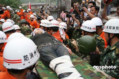 5月17日晚18時30分,在地震重災區四川什邡市鎣華鎮,鄭州消防支隊所在的河南總隊抗震救災突擊隊第一梯隊成功營救一名被廢墟埋壓124小時的婦女。中新社發 申治民 攝
