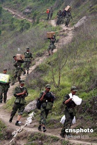 5月17日,濟南軍區某部600多名官兵手拿肩扛徒步到達汶川縣映秀鎮送上災民急需的藥品。中新社發 張雷 攝