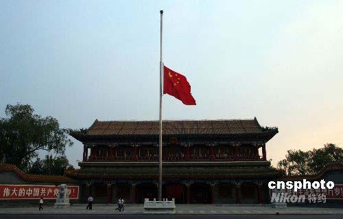 5月19日清晨,北京新華門下半旗,哀悼5·12汶川大地震中遇難同胞。中國國務院作出決定,5月19日至21日為全國哀悼日。在此期間,全國和各駐外機構下半旗志哀,停止公共娛樂活動,中國外交部和中國駐外使領館設立吊唁簿。5月19日14時28分起,全國人民默哀3分鐘,屆時汽車、火車、艦船鳴笛,防空警報鳴響。中新社發(fā) 張宇 攝