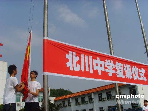 復(fù)課儀式上,五星紅旗在同學(xué)們的國歌聲中冉冉升起,降半旗向地震遇難者致哀。同學(xué)們重新返回課堂,用堅(jiān)強(qiáng)的意志備戰(zhàn)高考。中新社發(fā) 霍潺 攝
